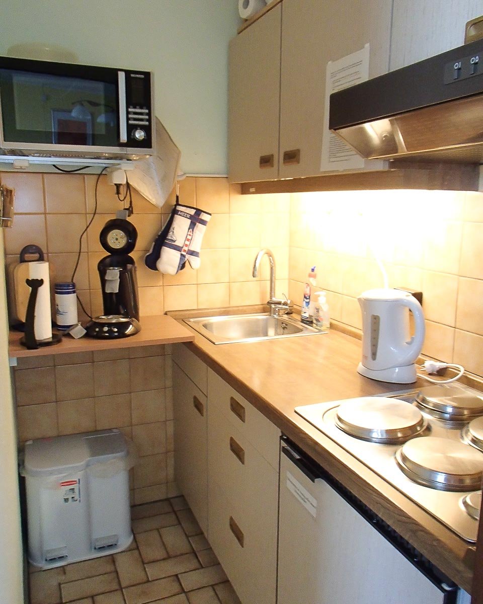 Ein Reisebett und ein Kinderhochstuhl sind vorhanden. In der Küchenzeile befindet sich Geschirr, Töpfe und Pfannen, eine Mikrowelle mit Heißluft und 4 Herdplatten. Um auch einmal schlechteres Wetter überbrücken zu können, steht ein DVD- Player (DVD’S sind selbst mitzubringen), Fernseher und eine Stereoanlage bereit.